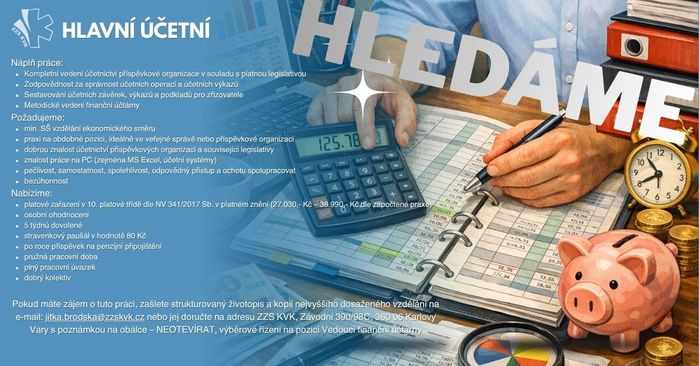 Bližší informace o druhu práce podá Jarmila Bartošová, hlavní účetní ZZS KVK, na tel.: 353 362 532.